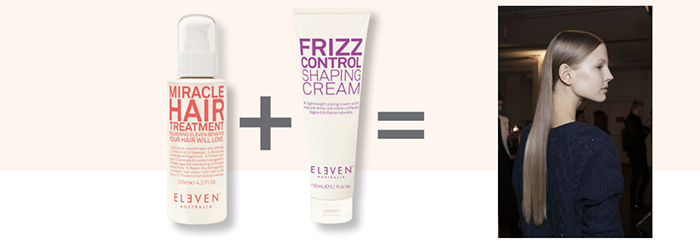 Method: Start with a base of Miracle Hair Treatment and follow up with a combo of Smooth & Shine Anti-Frizz Serum and a tiny amount of Frizz Control Shaping Cream. Blow-dry in.